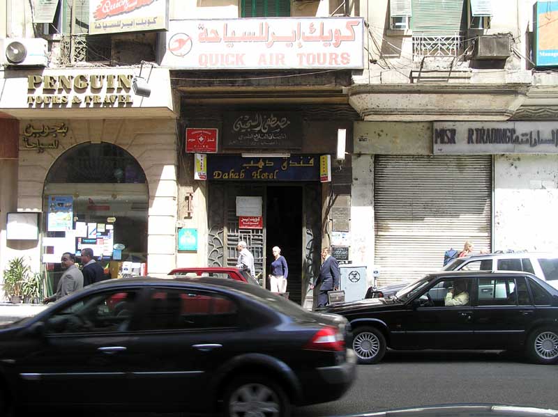 Ubytování: V Káhiře jsem bydlel v hotelu Dahab. Jednolůžkový pokoj (s větrákem) za 20 EL, dvoulůžkový (bez větráku) za 25 EL. Personál tam je prima, ten dvoulůžák jsem pak ukecal na dvacku, přivedl jsem jim tam totiž dva Němce.