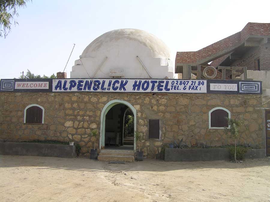 No a hned jak vás autobus vyklopí na autobusáku v oáze, hemží se to kolem vás náhončíma do různejch hotelů. Já byl poučenej, ať se ptám na hotel Alpenblick. Náhončí odtamtud tam byl taky. Hotel je asi 200 m od zastávky a tak tam v pohodě dojdete pěšky.
